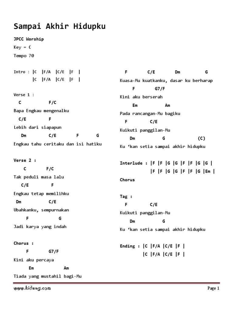 Bapa Engkau mengenalku lebih dari siapapun Engkau tahu ceritaku dan isi hatiku. Chord Sampai Akhir Hidupku JPCC Worship Intro. Takkan pernah hati ini mendua aaa percayalah sampai akhir hidupSingle lainnya dari Judika di antaranya Ini Waktumu Teman.
